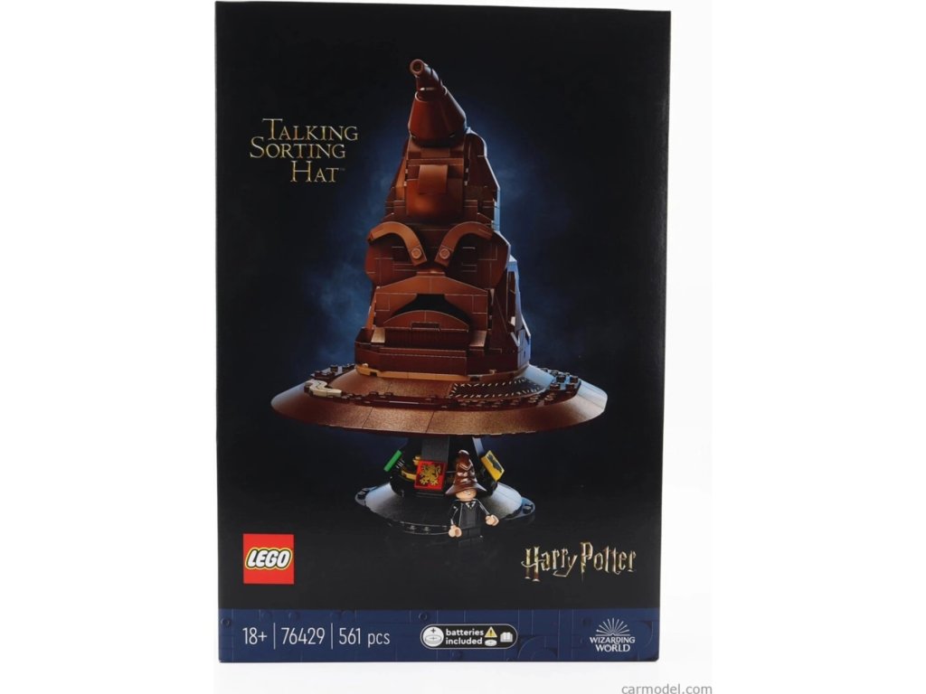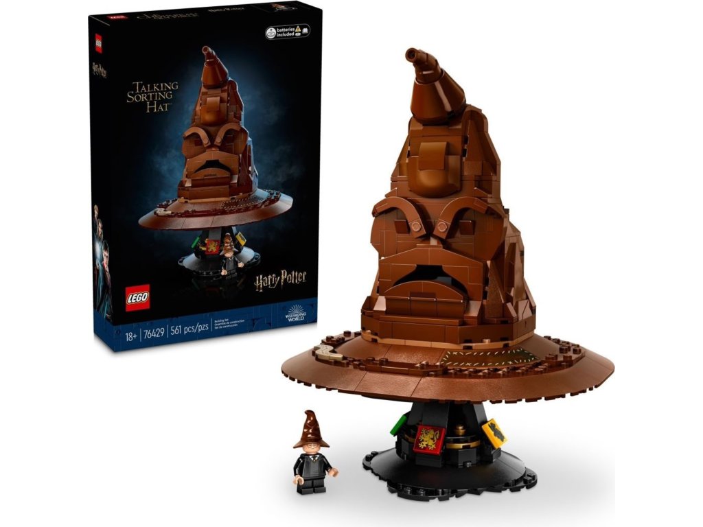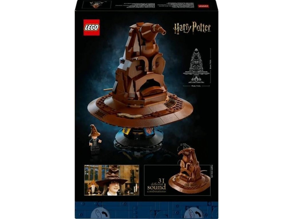 LEGO® Harry Potter™ Mluvící Moudrý klobouk je sběratelský model pro dospělé, který kombinuje 561 dílků, interaktivní zvukovou kostku se 31 zvuky a stylový podstavec s erby čtyř kolejí. Sada obsahuje minifigurku Harryho, přiložené baterie (3× LR44) a digitální 3D návod v aplikaci LEGO Builder; je určena především na vystavení.